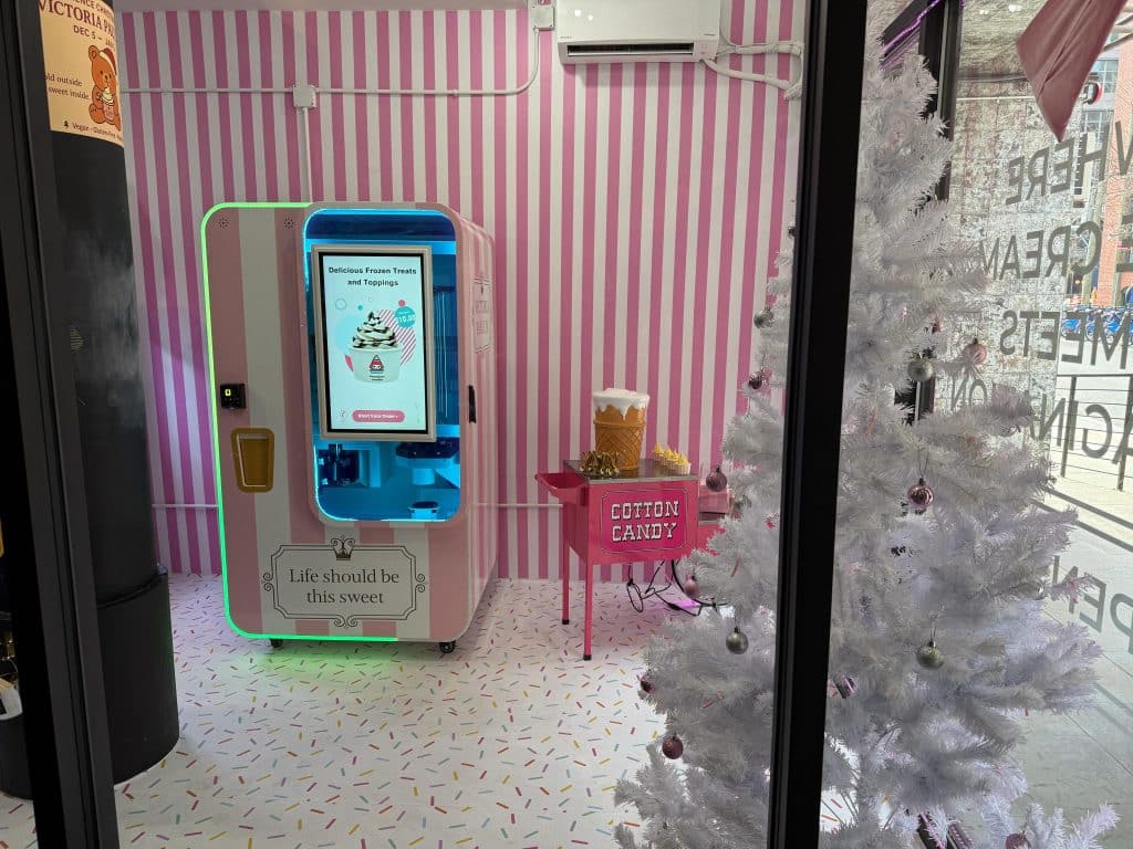 The custom branding transforms the kiosk into a premium dessert destination — reinforcing trust, quality, and repeat engagement.